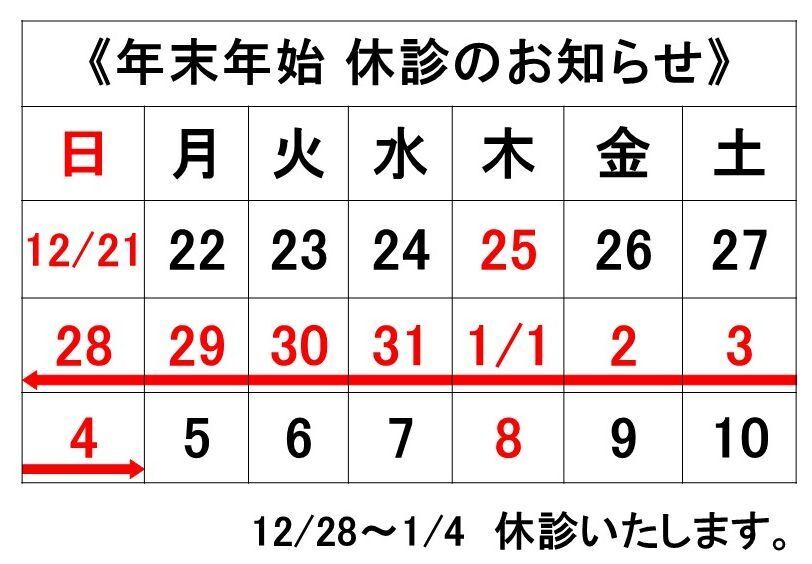 年末年始、12/28~1/4 休診いたしますので、お早目の受診をお願いいたします。